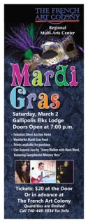 As you know, I am involved in so many valuable organizations. I have been asked to be the Special Event Chair for the French Art Colony (FAC) www.frenchartcolony.org in Gallipolis. The event that I am currently working on is MARDI GRAS NIGHT. I am getting really excited about it the more things come together. This is one of the biggest fundraisers of the year for the FAC through a silent auction. So far we have trips, golf, movies, dinners, tools and SO MUCH MORE coming in for the silent auction! I can’t wait for the food and live acoustic music from friends of mine; Jenny Walker with Mark Ward and saxophonist Whitney Hess! Tickets are $20 each and we have limited quantities for purchase so get your tickets EARLY!