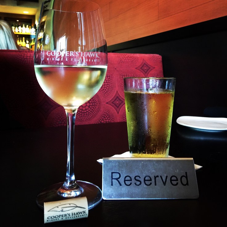 We went to one of our favorite spots, Cooper’s Hawk Winery, at Easton for lunch and beverages. We were seating in an area off from the bar ~ not out in the dining area where we always eat ~ and it was nice and laid back. It was, I wasn’t unbeknownst to me. The sweet server came and asked what we would like to drink. GW ordered his and I handed her my wine club membership card and asked if I had any to pick up that I can never remember from trip to trip. She went to check and that took a while. She came back with the card and no drink for GW yet. I can see the bar from where I’m sitting mind you. She took off and came back – still zero beverage for GW and no wine for me. We had water and our bread so were weren’t without but we were ready to toast to a weekend getaway and the bride and groom elect.
