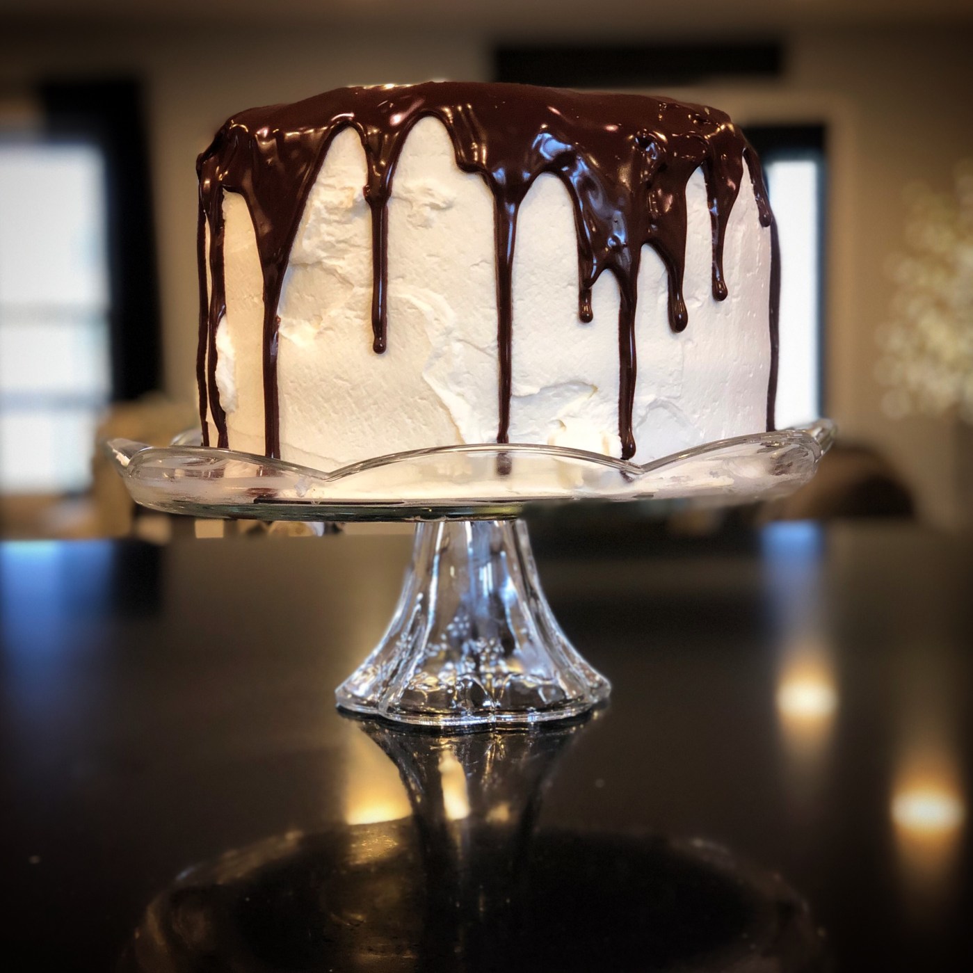 I transfer this mixture into a glass measuring cup allowing it to cool 8 to 10 minutes. Remove cake from the refrigerator, starting in the center of the cake slowly pour the chocolate topping allowing it to glide down the sides. You can move the chocolate around gently with the spatula to guide it over the sides. Careful not to press down and expose the frosting.
