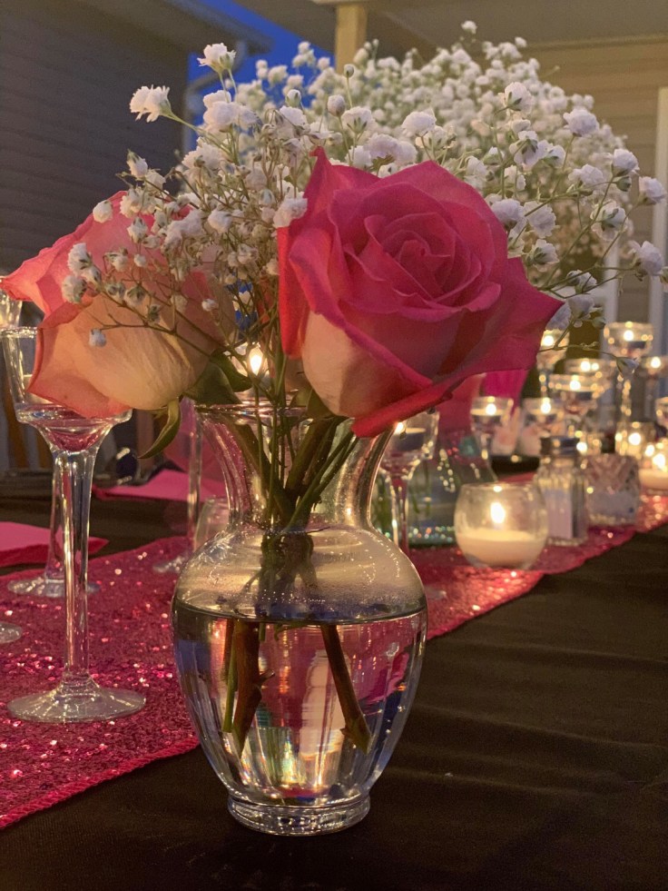 I recently found a little plaque at HobbyLobby that says – SHOPPING RULE: if it isn’t black, put it back. Black is our signature color. I have had people say to me – I would love to see your closet and all the black clothing you have – well – you see me out – you see my closet. Amy is the same way adding sparkles and pink to her signature. Thus the theme for the evening. All things pink. Giving me a good reason to shop for a new table cloth and runner! Click here for the link to the hot pink runner on Amazon and here for the tablecloth. Keep in mind that my patio table is 16 feet long should you follow the link to order.