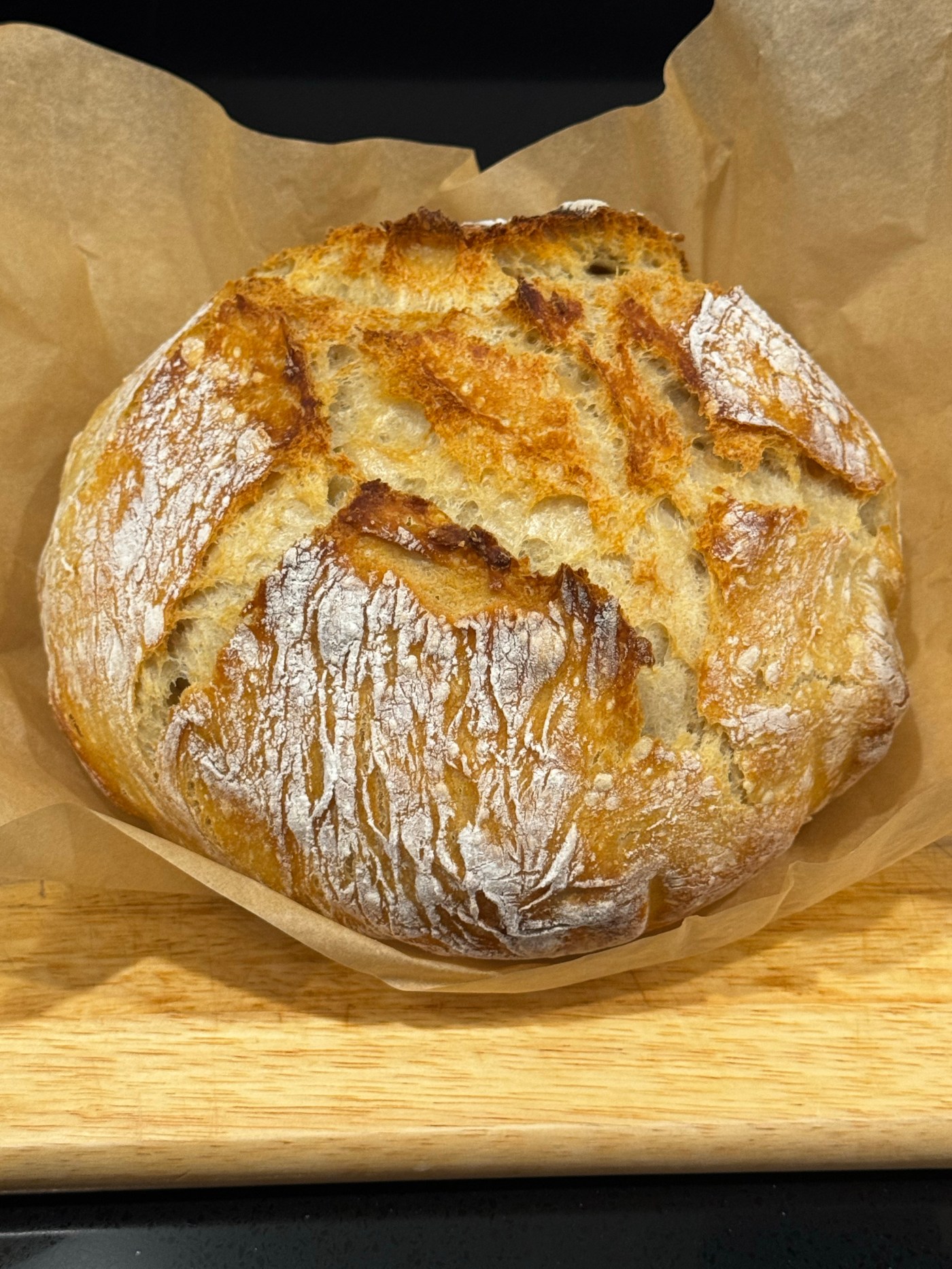 - Carefully, place bread in Dutch oven lined with parchment paper.