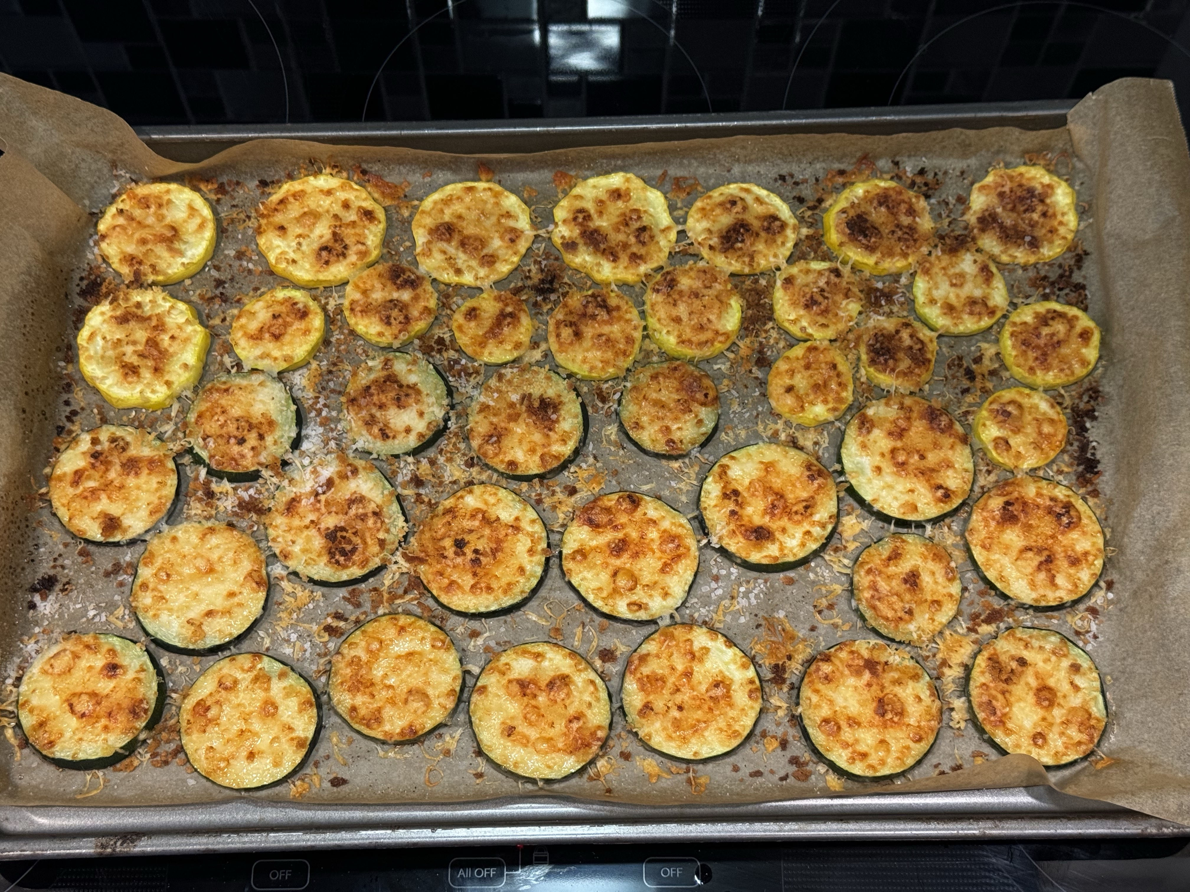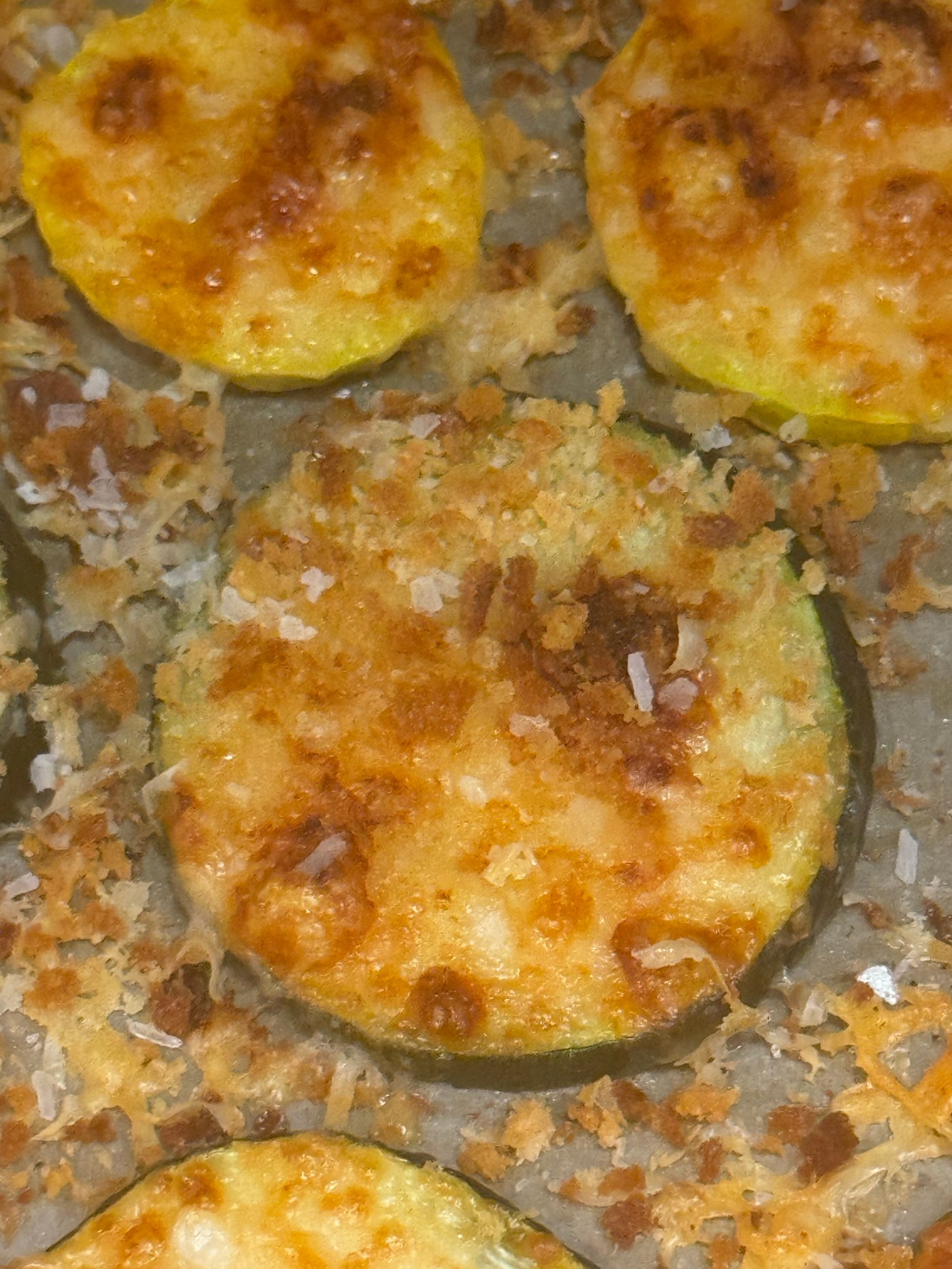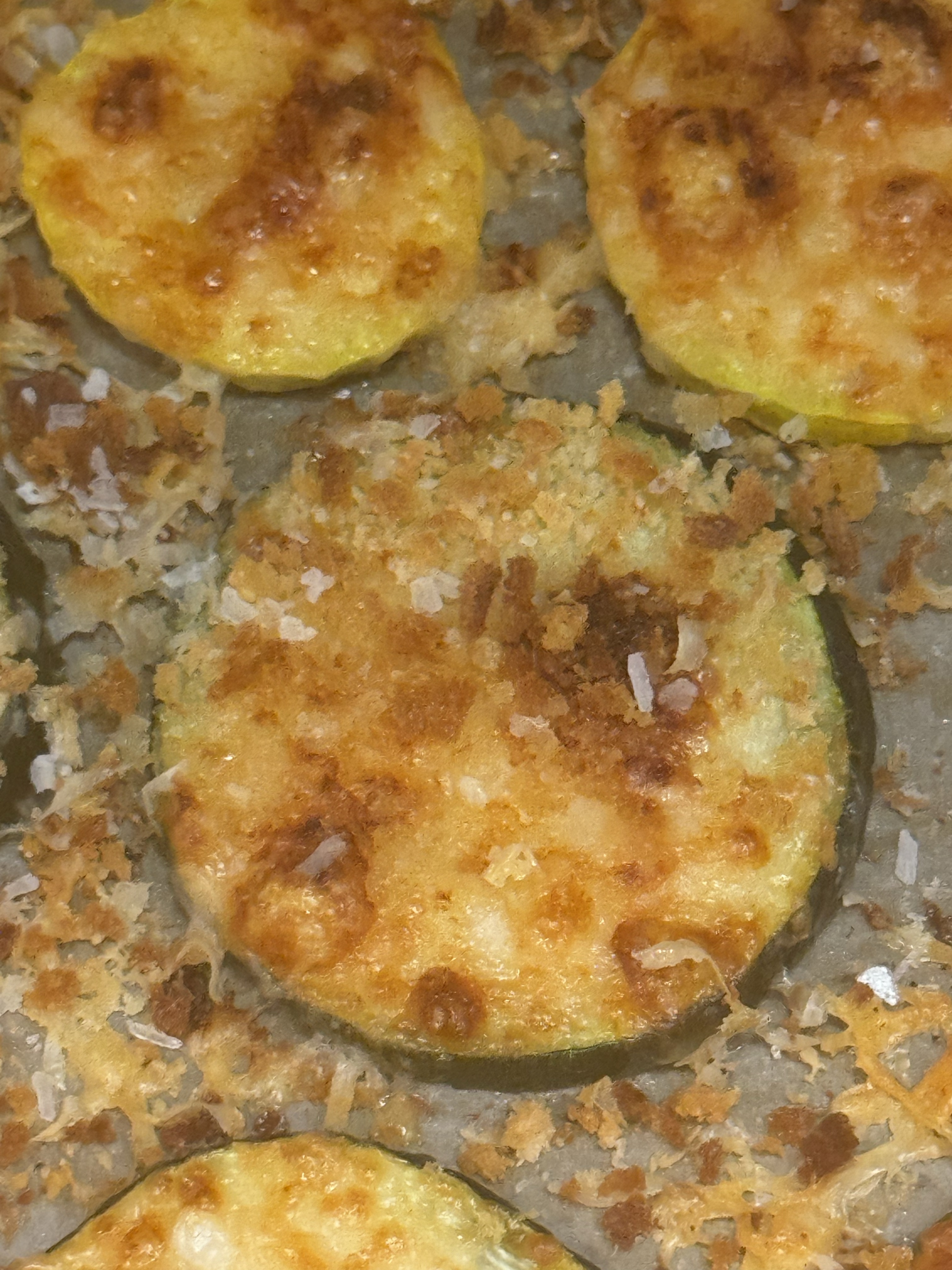 I used two yellow squash and one zucchini sliced into thinnish rounds. Lightly and I do mean lightly, spray the parchment paper. Place the rounds on the sheet and sprinkle with garlic salt to taste. Place a pinch of grated parmesan on each round. Lightly, press the parmesan onto the round.