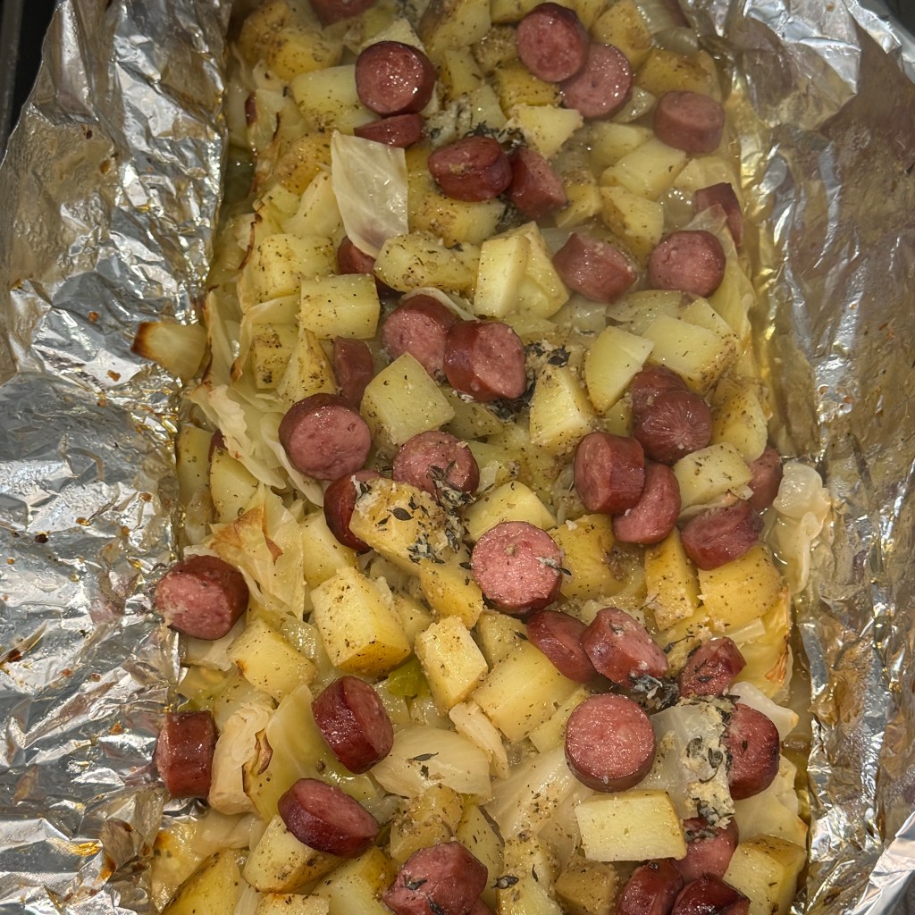 For dinner, I served cabbage, onion, potato and kielbasa packets along with homemade mac & cheese, flat green beans, sautéed onions, jalapeño and cheese brats, hot dogs, mini cornbread muffins, cake and ice cream.