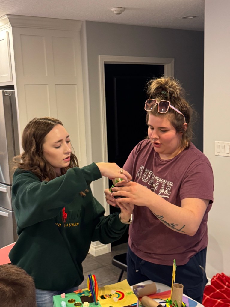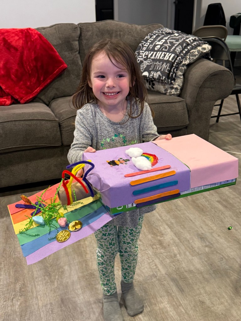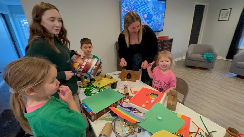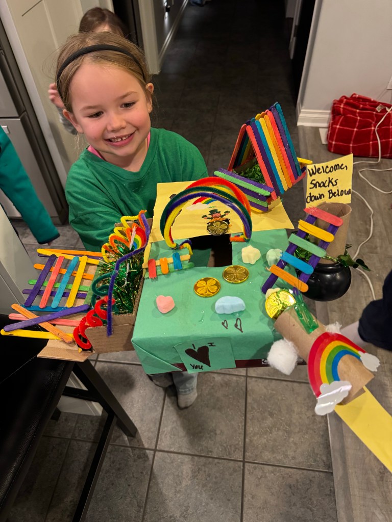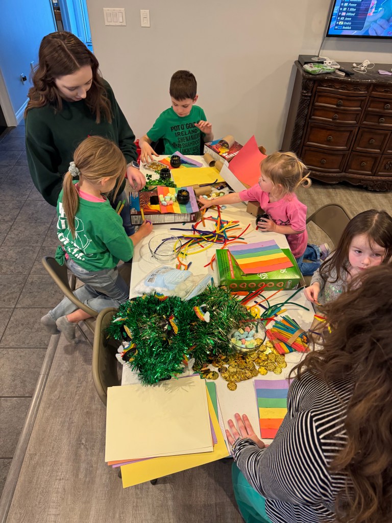 Afterward, it was time to make Leprechaun Traps! Watching their young minds work is pure enjoyment for me. For weeks, I’ve collected boxes and toilet paper rolls while gathering decorative supplies. Dollar Tree for the win!!