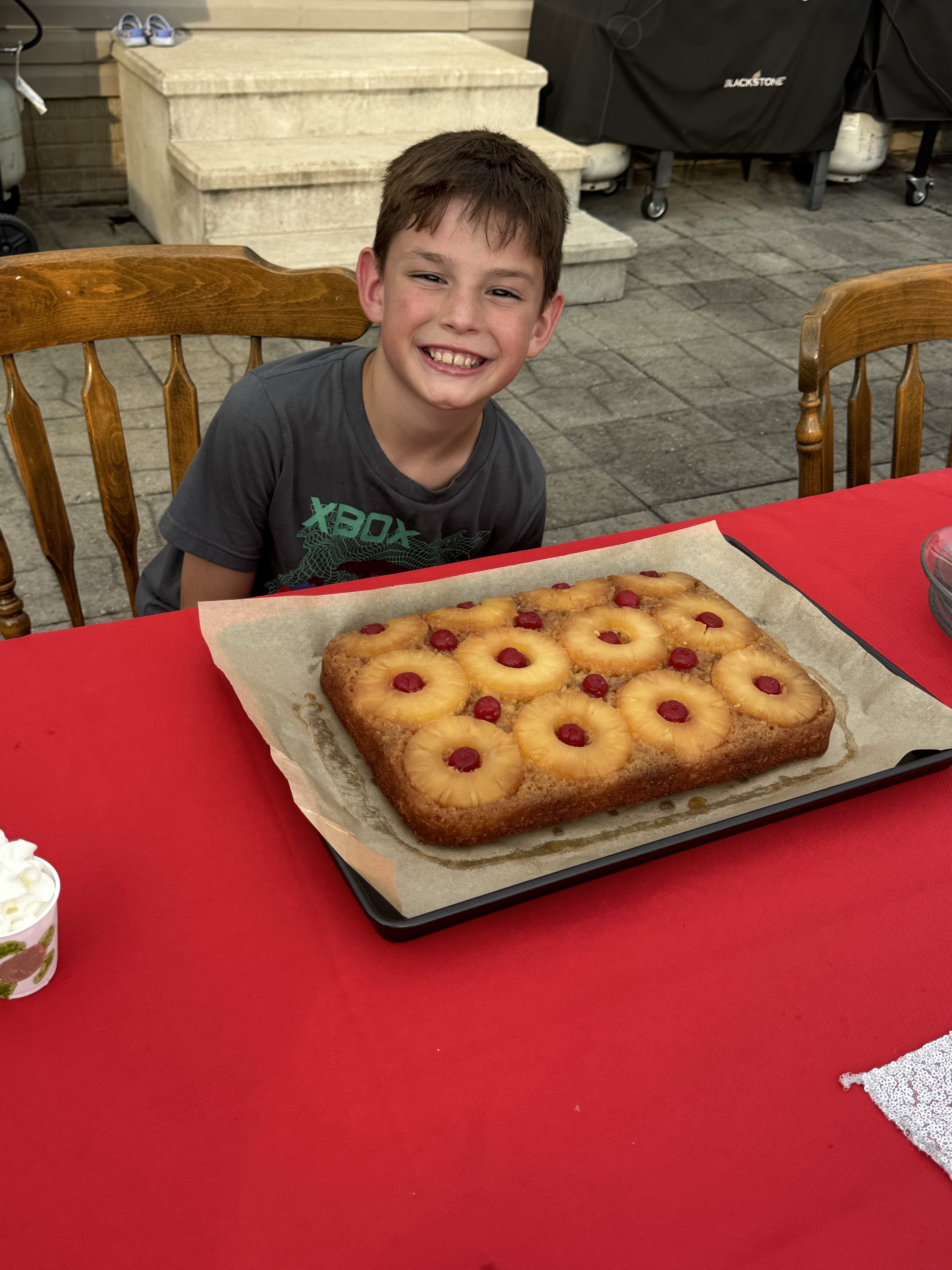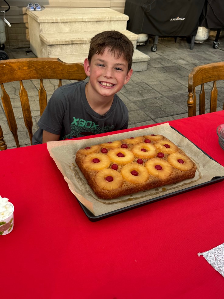 I couldn’t decide on a meal this month until a week before. I settled on doing hot dogs and hamburgers on the grill. Greg said it was perfect for the theme of red, white and blue! For sides, I made homemade pasta salad, macaroni salad and chip dip along with homemade hot dog sauce. I also served baked beans, the chips & dip and corn on the cob. For dessert, I made my very first pineapple upside down cake in honor of Luke’s 9th birthday. I prayed over that cake like you wouldn’t believe!! He told me it was the best cake he has ever had which hit me right in the feels!!!